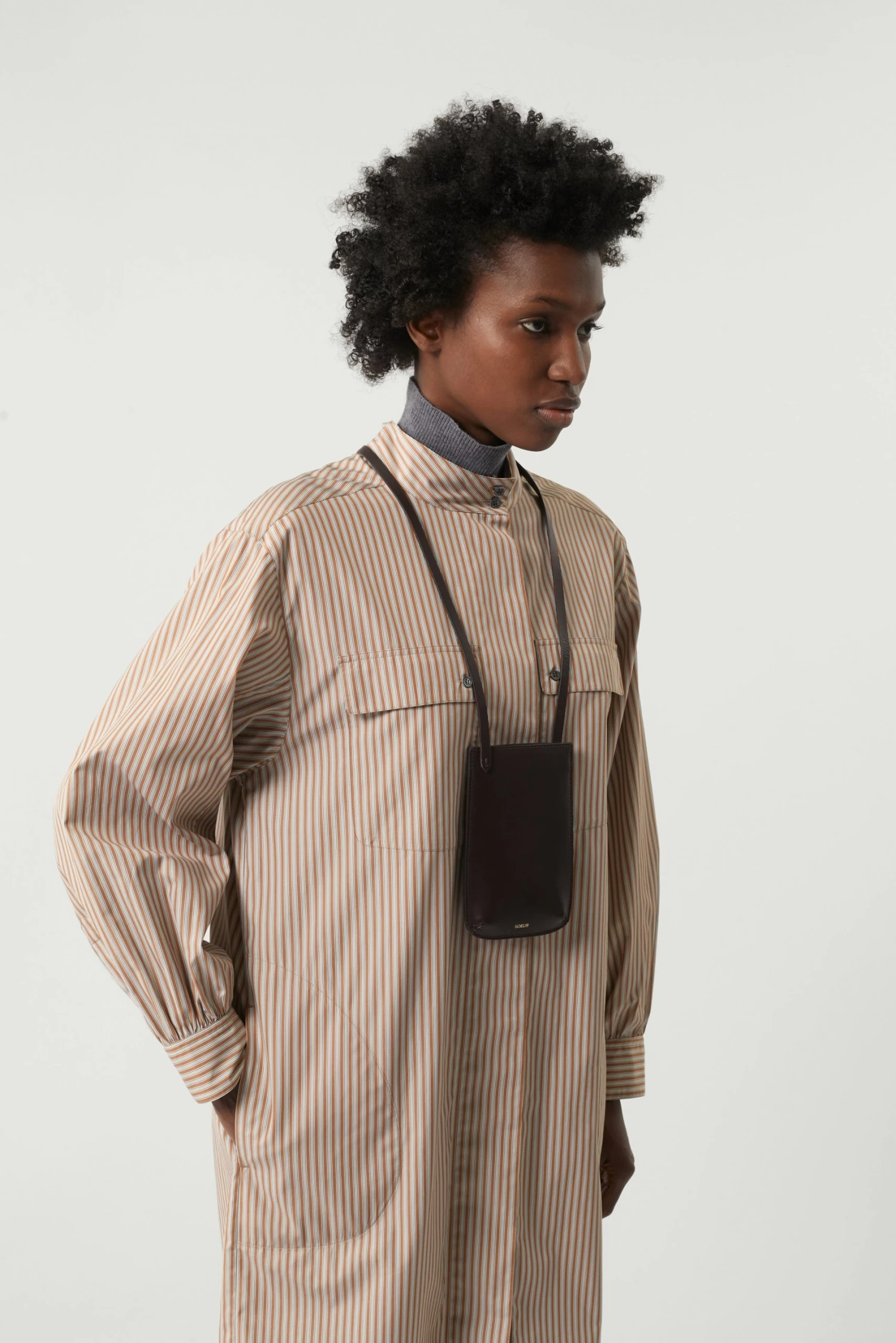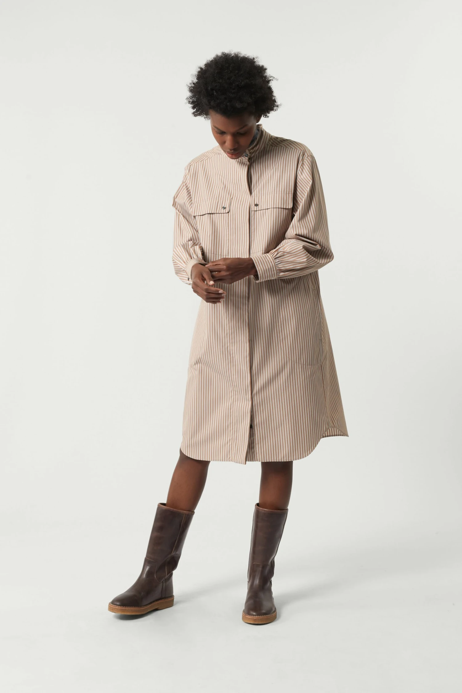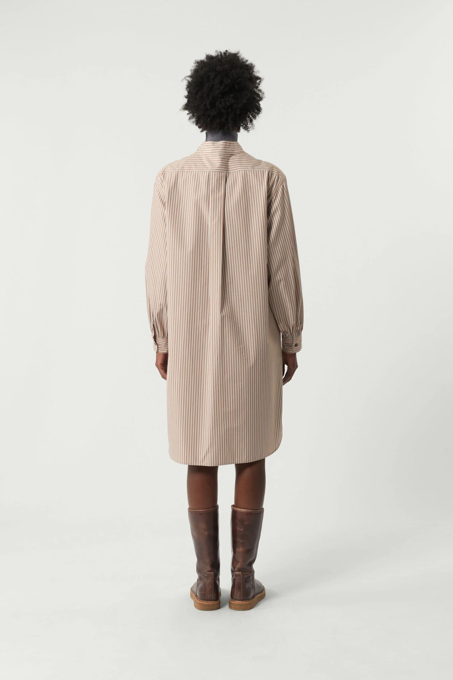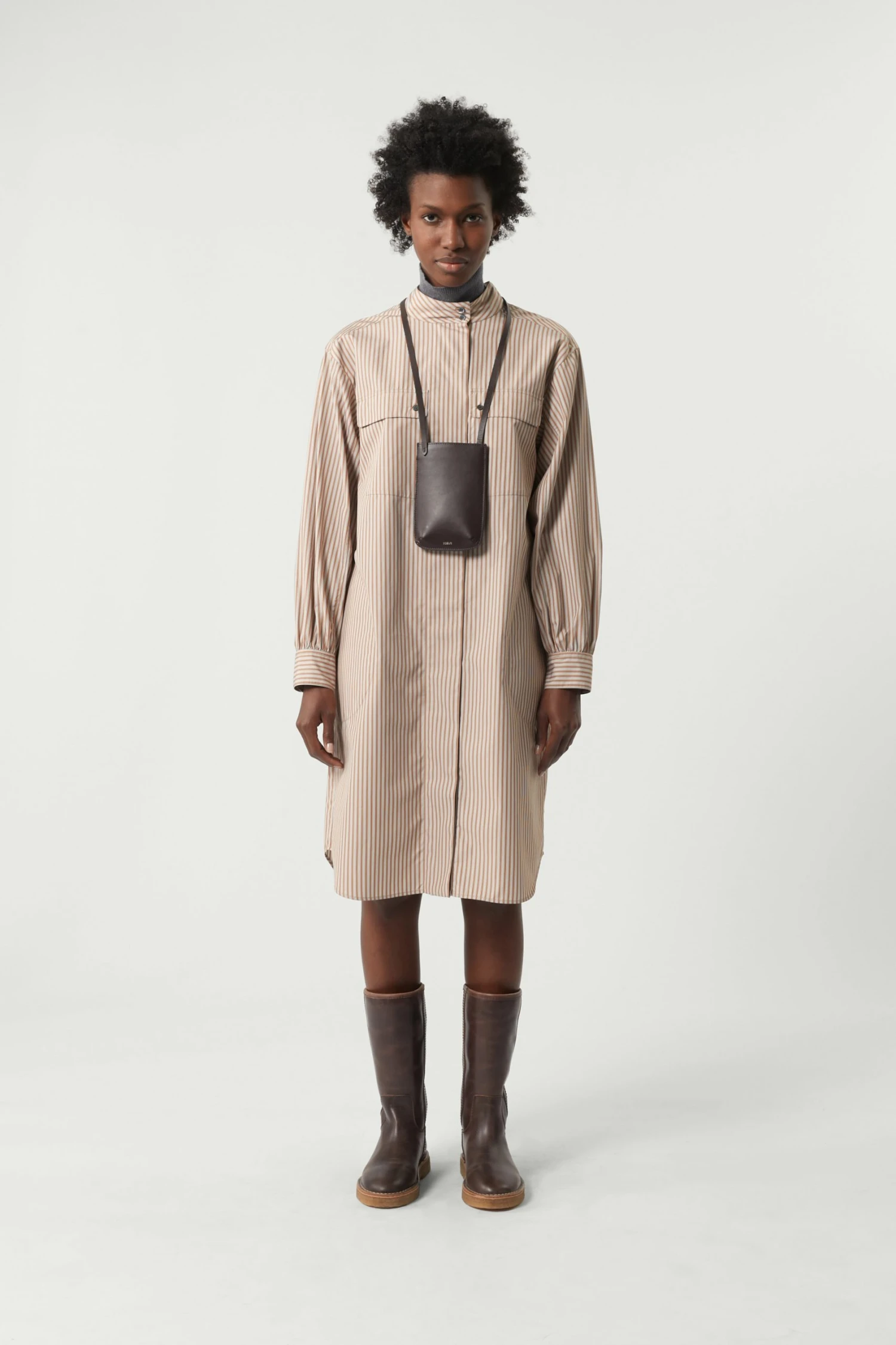 Siegrid est une robe qui arbore le même col montant emblématique des collections Sœur et une patte de boutonnage avec un jeu de boutons cachés et visibles à l’avant. Elle est mi-longue, idéale à porter seule avec des bottes par exemple ou à superposer à un col roulé pour créer un jeu de contraste.