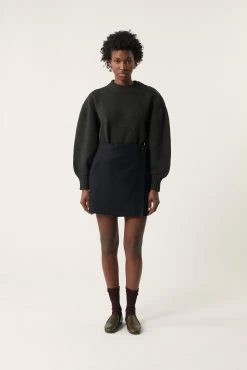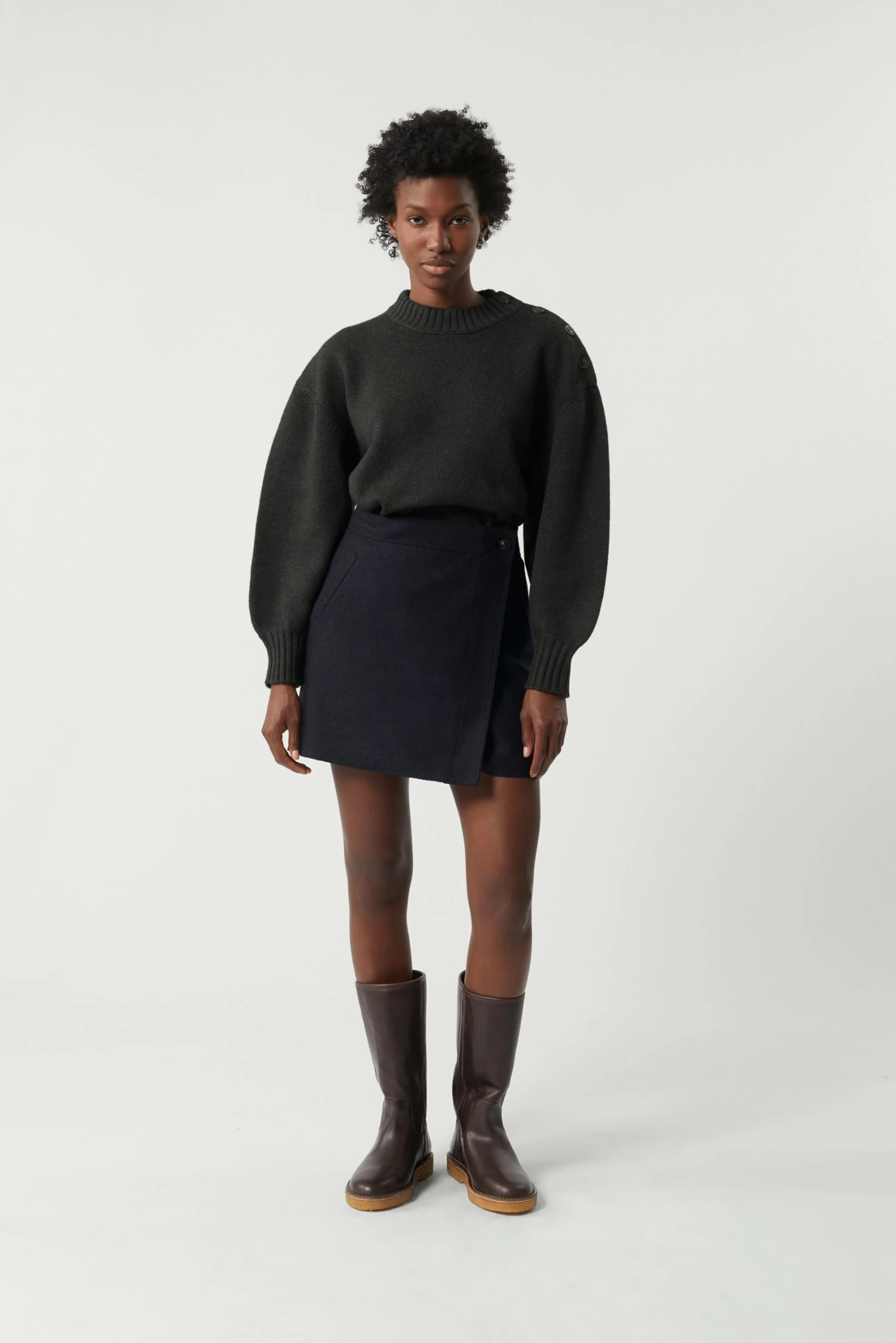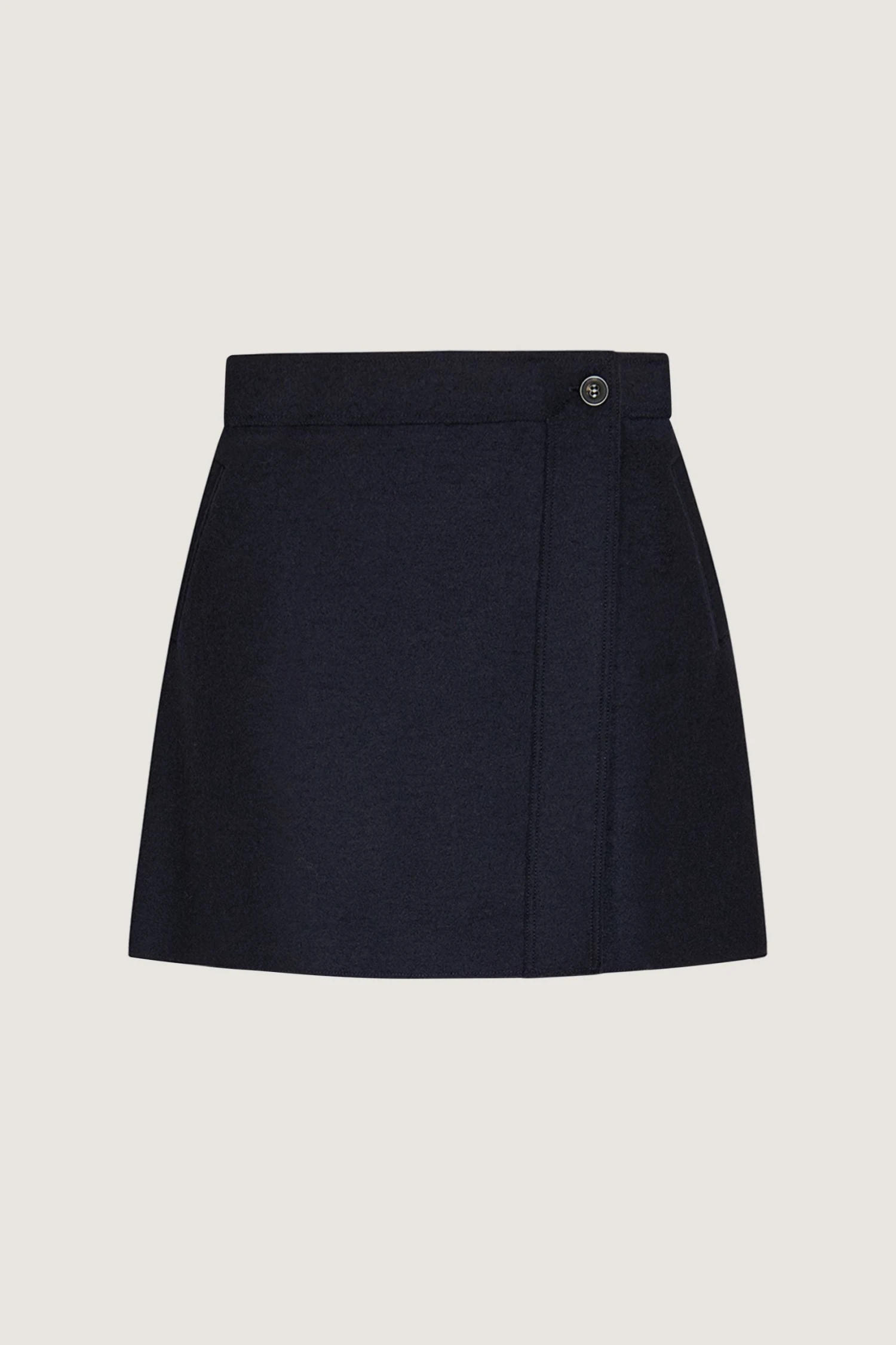 Saga est une mini jupe portefeuille en laine bouillie. Les détails de surpiqures ajoutent du relief et de la structure au modèle.