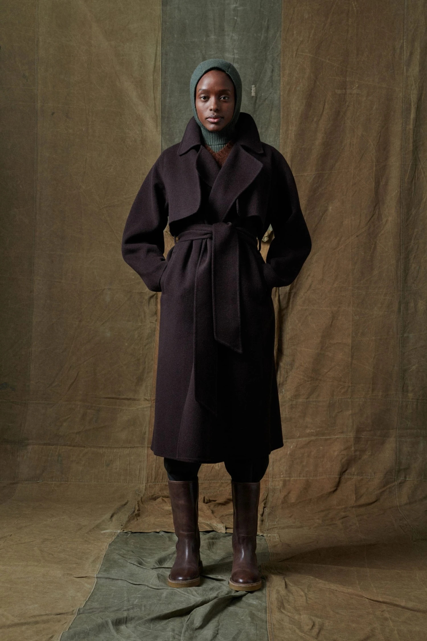 Le manteau Stalingrad reprend tous les codes d’un trench (porté croisé, ceinture, emmanchures marteau et bavolets devant et dos) sur une matière inattendue : le drap de laine double face.
