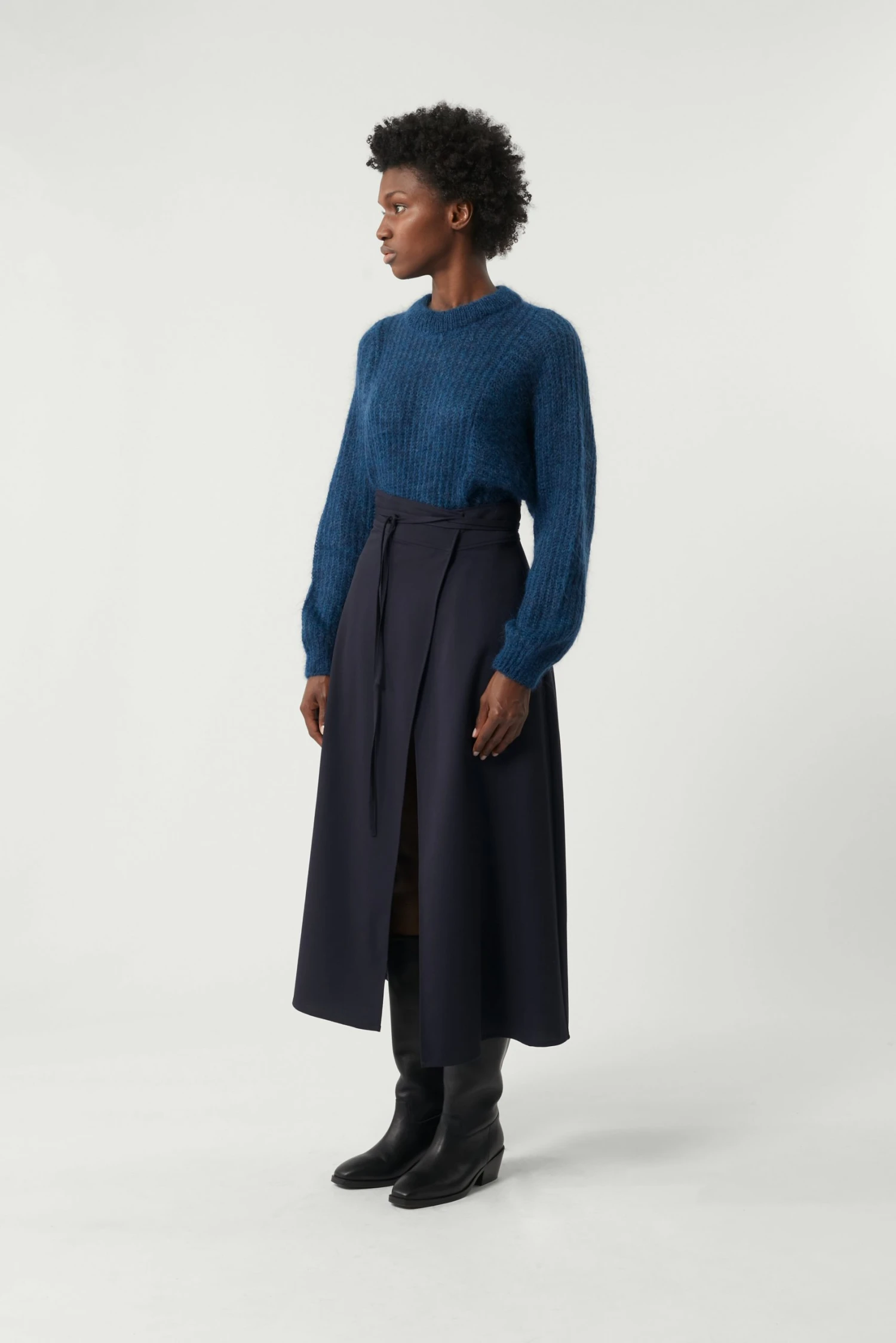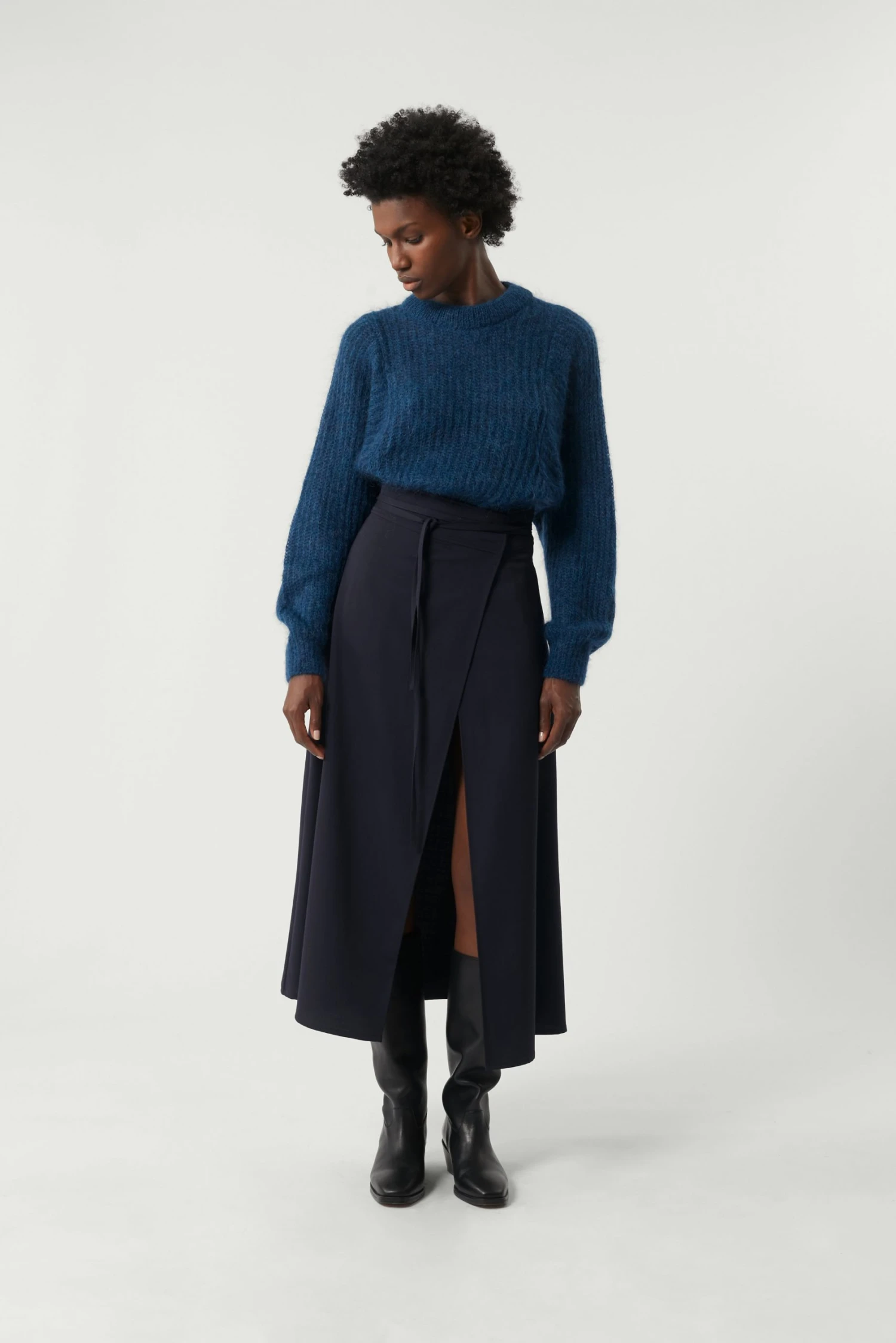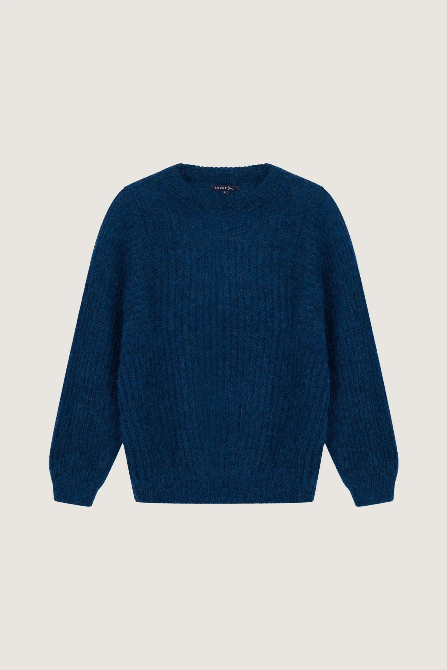 Le pull Sissi possède une emmanchure carrée donnant à la manche un plus grand volume. C’est un pull du quotidien, fait en mohair dans une maille aérée et vaporeuse.