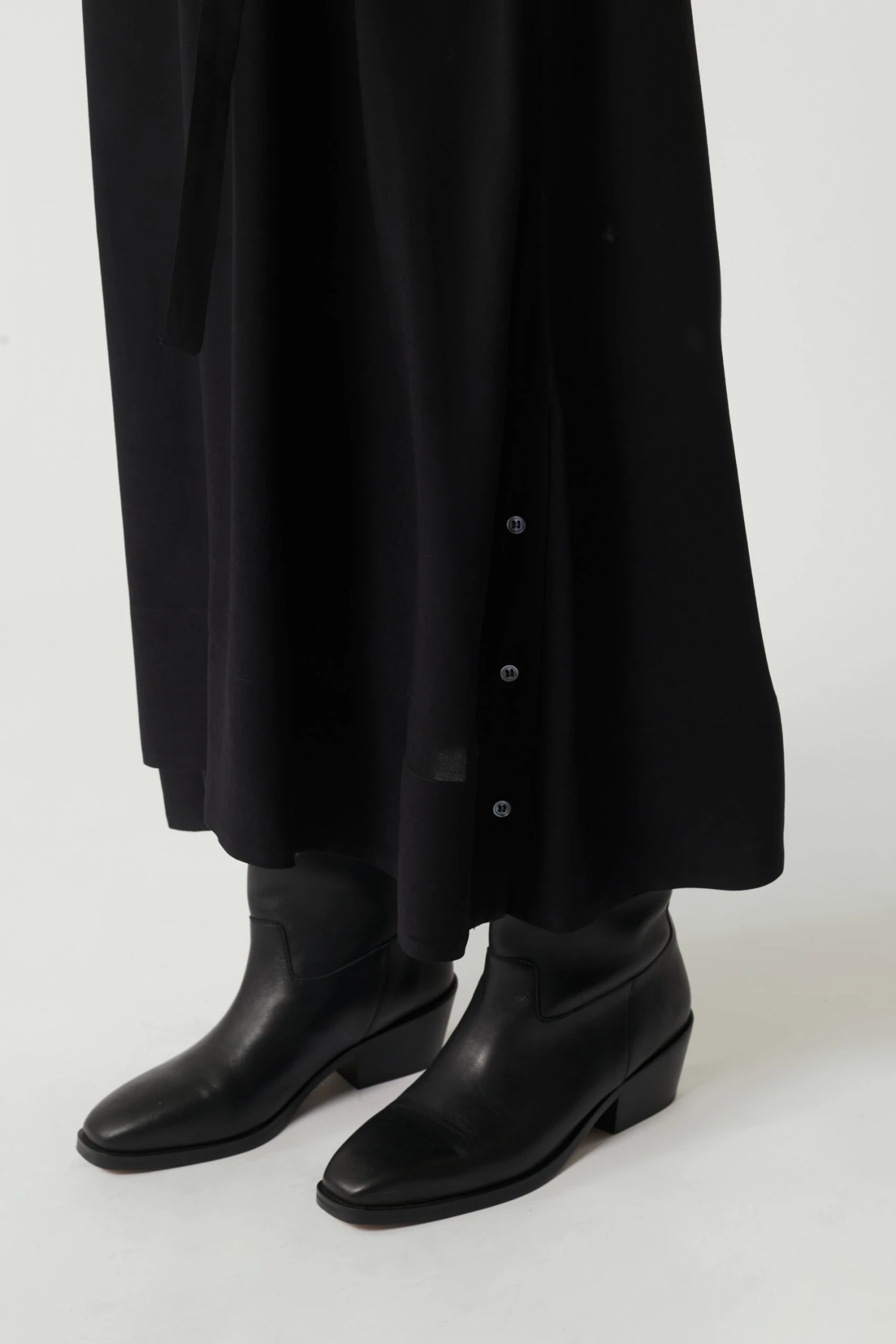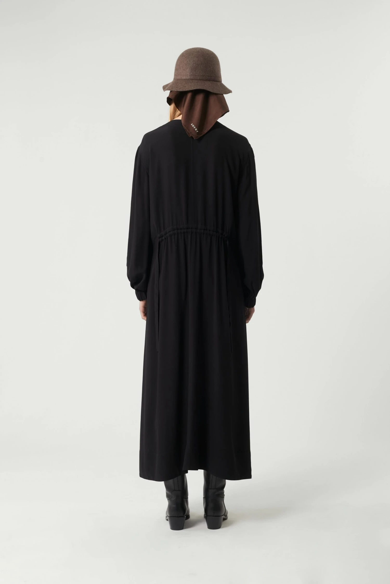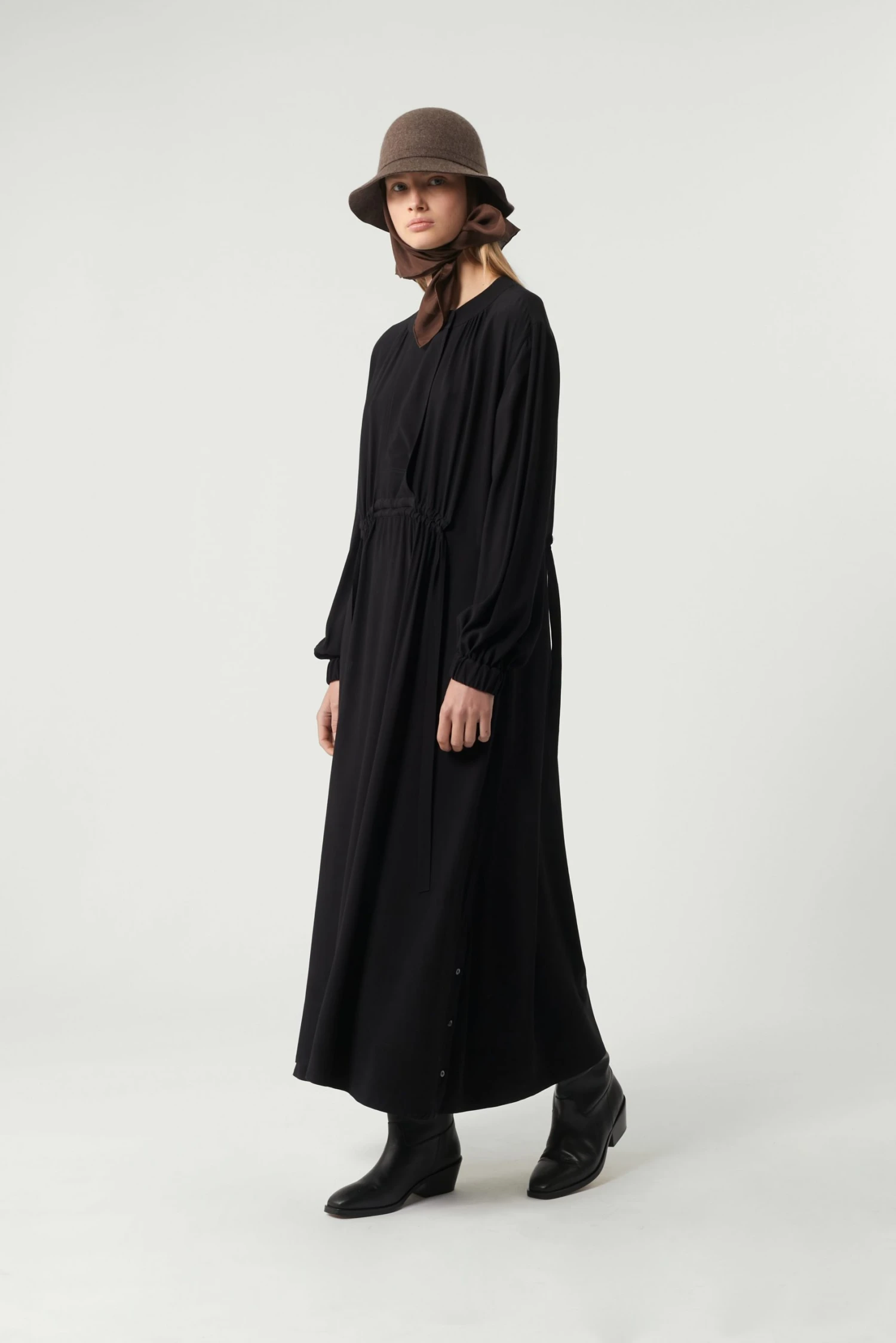 Salamanque est une robe du quotidien en popeline légère. Son volume large est créé par un jeu de fronces ramassées à la taille qui répondent à celles de l’encolure. Les fentes boutonnées aux côtés ajoutent du mouvement à la démarche et une touche sport.
