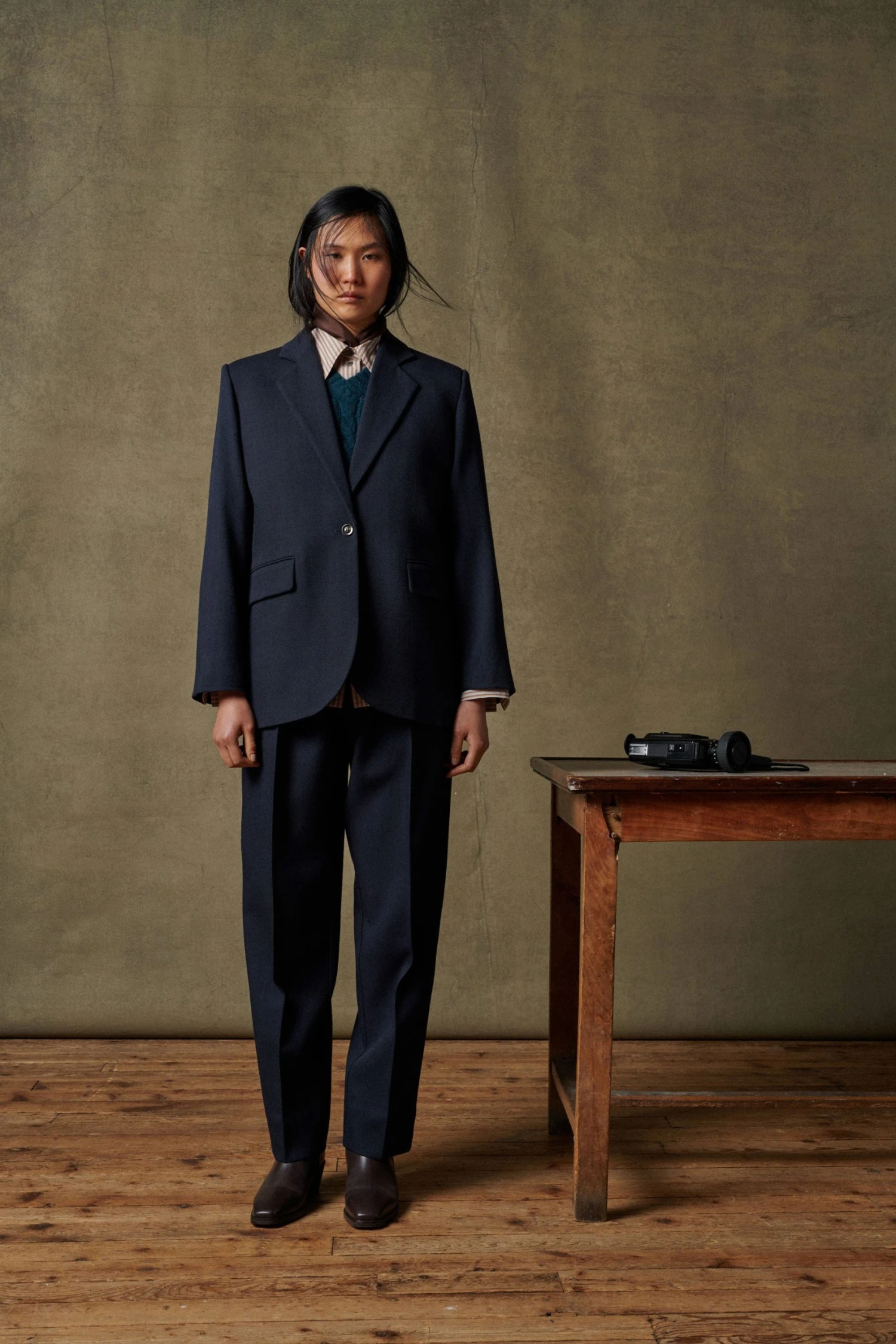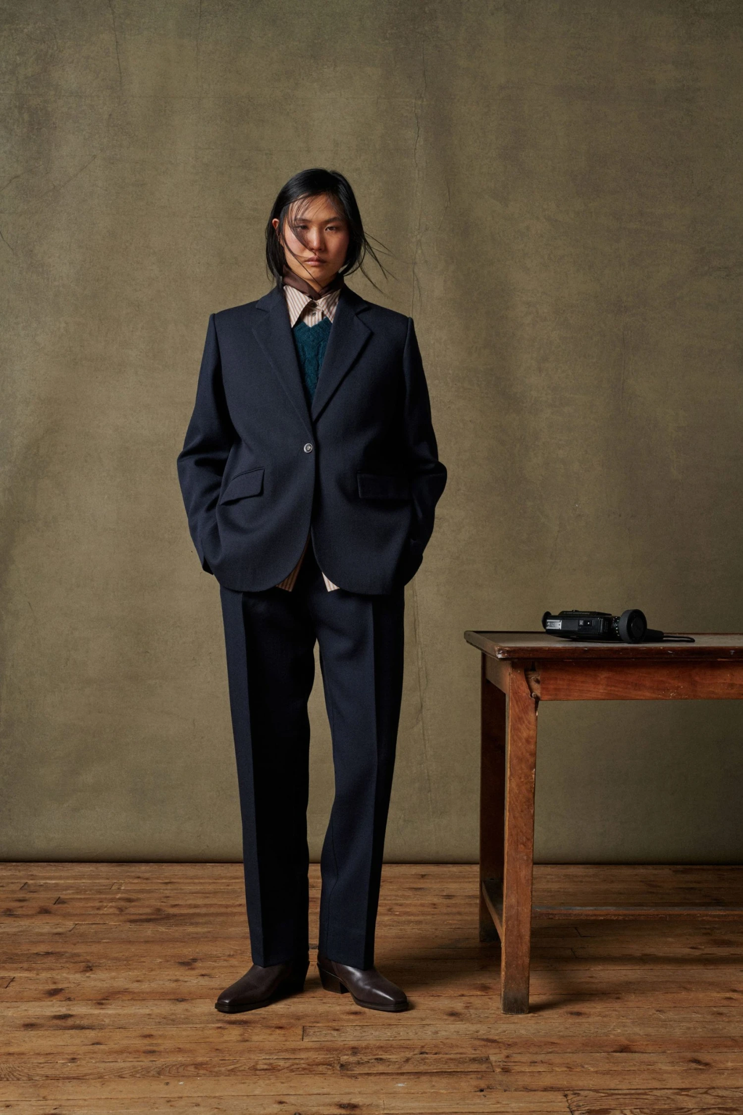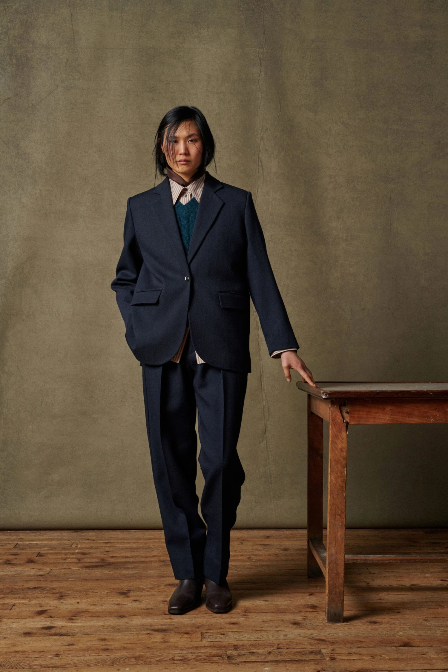 La veste Sèvres reprend tous les codes d’une vraie veste de tailleur. Il s’accorde au pantalon Roméo tout deux composés de sergé de laine, matière épaisse et masculine, aidant à maintenir le volume et les découpes de ces modèles structurés.